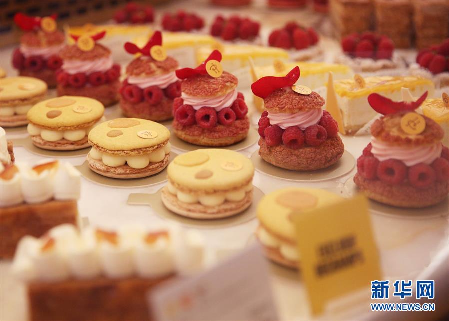 这是9月3日在法国巴黎知名马卡龙甜品店拉迪雷内拍摄的马卡龙衍生的各式甜点。新华社记者 高静 摄