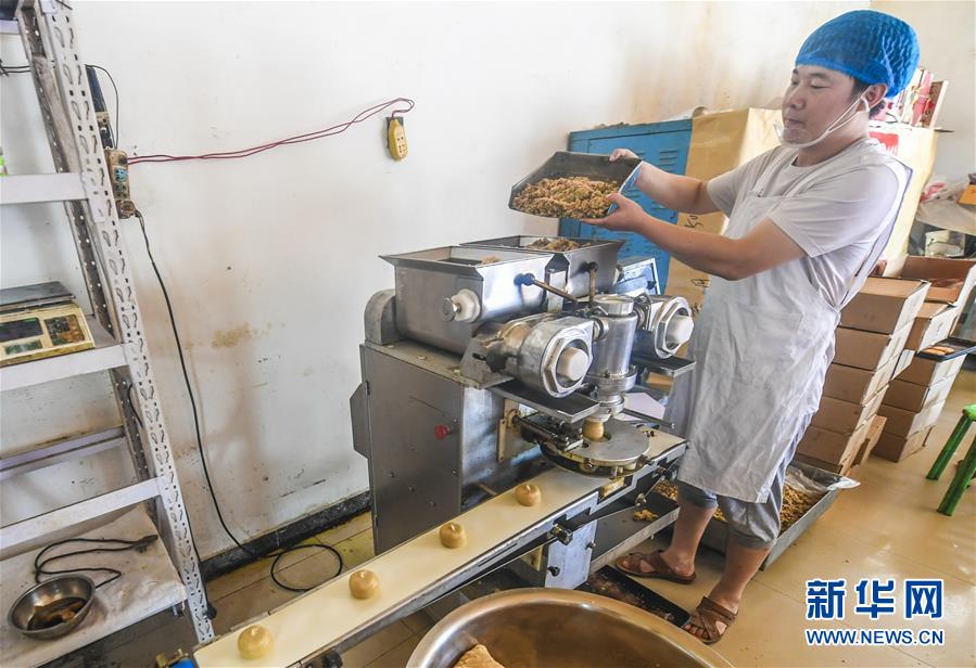 9月5日,河北安平县安平镇政宣村的老孟家的传统手工月饼铺的师傅在给成型机添加月饼馅。 临近中秋,河北省安平县安平镇政宣村的老孟家月饼铺加紧赶制手工月饼,为当地百姓献上中秋传统美食。据了解,老孟家传统手工月饼铺已有三十余年历史,旺季时他们每天烤制月饼千余斤,其现制现卖、价格实惠、充满老味道的传统手工脆皮月饼受到当地百姓的欢迎。 新华社记者李晓果摄