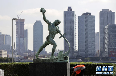 这是9月11日在位于纽约的联合国总部拍摄的雕塑“铸剑为犁”。 新华社记者李木子摄