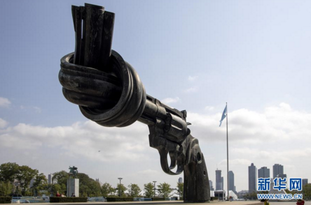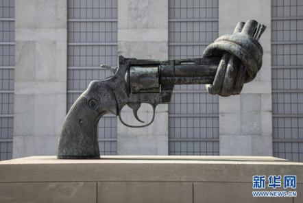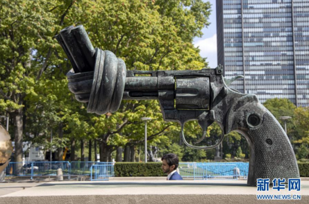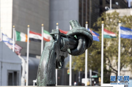 这是9月11日在位于纽约的联合国总部拍摄的雕塑“非暴力”。 新华社记者李木子摄