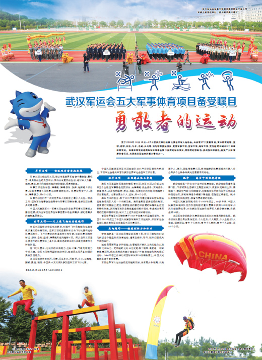 定于2019年10月18日—27日在武汉举行的第七届世界军人运动会,共设有27个竞赛项目,其中既有足球、篮球、排球、田径、马术、击剑、乒乓球、羽毛球等奥运项目,更有军事五项、空军五项、海军五项、定向越野和跳伞5个军事体育项目。军事体育项目是国际军体理事会旗下独有的运动项目,其特有的惊险性、挑战性和神秘性,备受广大体育爱好者关注,也是武汉军运会的重大看点之一。