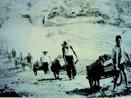 移民们靠着肩扛车拉改造大柴湖。湖北大柴湖教育基地提供
