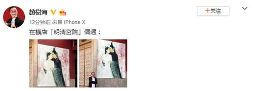 10月18日,赵又廷爸爸赵树海在微博晒出两张在横店拍摄的照片,并配文:“在横店「明清宫院」偶遇……”原来他偶遇的是赵又廷主演的《三生三世十里桃花》剧照,照片中,赵又廷与杨幂身穿剧装头靠头闭眼依偎,赵爸爸则穿着一身休闲装倚靠墙下与海报合影。