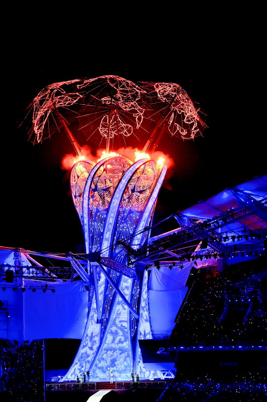原来,这里也遇到了艺术创意与技术矛盾的冲突。青花瓷瓶一样的火炬塔全身遍布星星点点的LED显示灯,一旦火焰温度过高,就会给显示灯带来问题。最终呈现出来的升腾火焰大小,是经过反复测试计算后的结果。