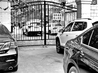 在朝阳区东一时区小区东门的一处消防通道附近,北青报记者注意到,该栅栏门大门已上锁,两侧开放了小门供居民通行。同时,门外的道路则停满了私家车。