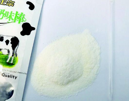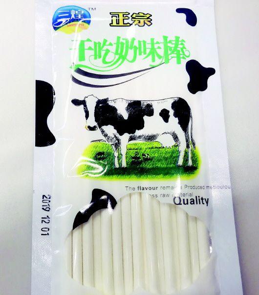 记者买了三包,在“干吃奶味棒”的包装袋背面,其产品类型一栏上写的是“粉末状固体饮料”。由于包装袋上并未配有食用方法,抽出一根奶棒后,记者一下子无从下口。旁边的小学生看到后,亲自示范吃法,“要想吃到里面的奶粉,要把管子竖起来倒进嘴里面,但是我喜欢将奶粉倒在纸上,用吸管慢慢吸着吃。”