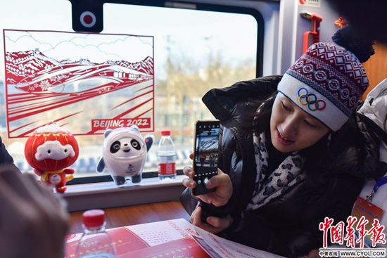 一名乘客正在拍摄2022年北京冬奥会吉祥物和车窗上的窗花。这些剪纸窗花是由张家口蔚县剪纸艺人创作,包含了詹天佑画像、京张高铁和冰雪运动等元素。实习生 宋欣然/摄