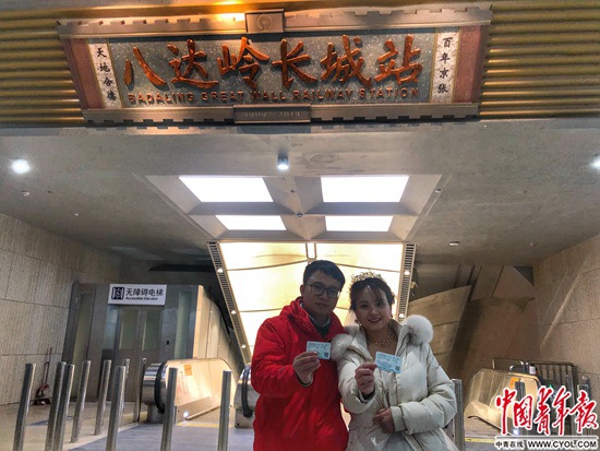最后检查完八达岭长城站的防撞条、电梯等细节后,手机屏幕的时钟跳到了深夜1点,32岁的胡维急忙赶回不远处的员工宿舍。那里,妻子肖雅萍正在屋里试婚纱。