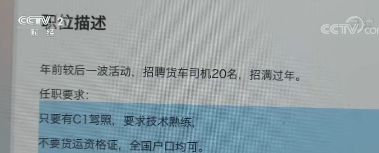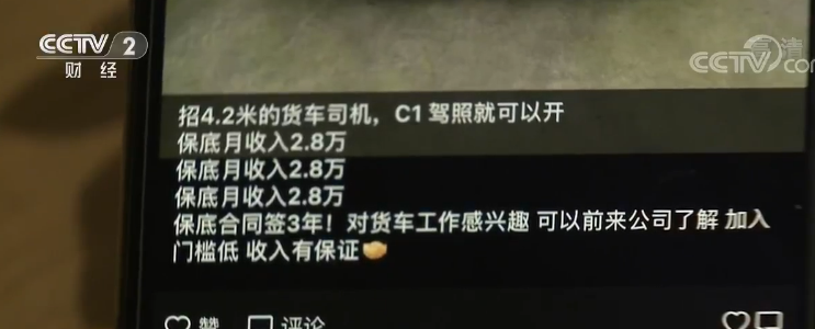 记者在采访中了解到,大多数贷款买车的人,以前并没有做过货车司机,对货运行业知之甚少,而招聘方承诺的“高收入”就是他们来应聘的最大动力。但当他们买完车开始拉货后才发现,这些公司提供的所谓的“保底合同”根本无法实现。