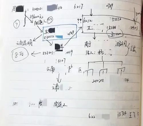 翻到位洪明工作笔记本的最新一页,是一张手绘的防疫口罩诈骗网的分析导图,虽然分叉复杂,但指向明确。从受害人到嫌疑人,一共8层关系网络,一层一层密密麻麻,摸清楚的写得明明白白,还没摸清楚的打着问号。