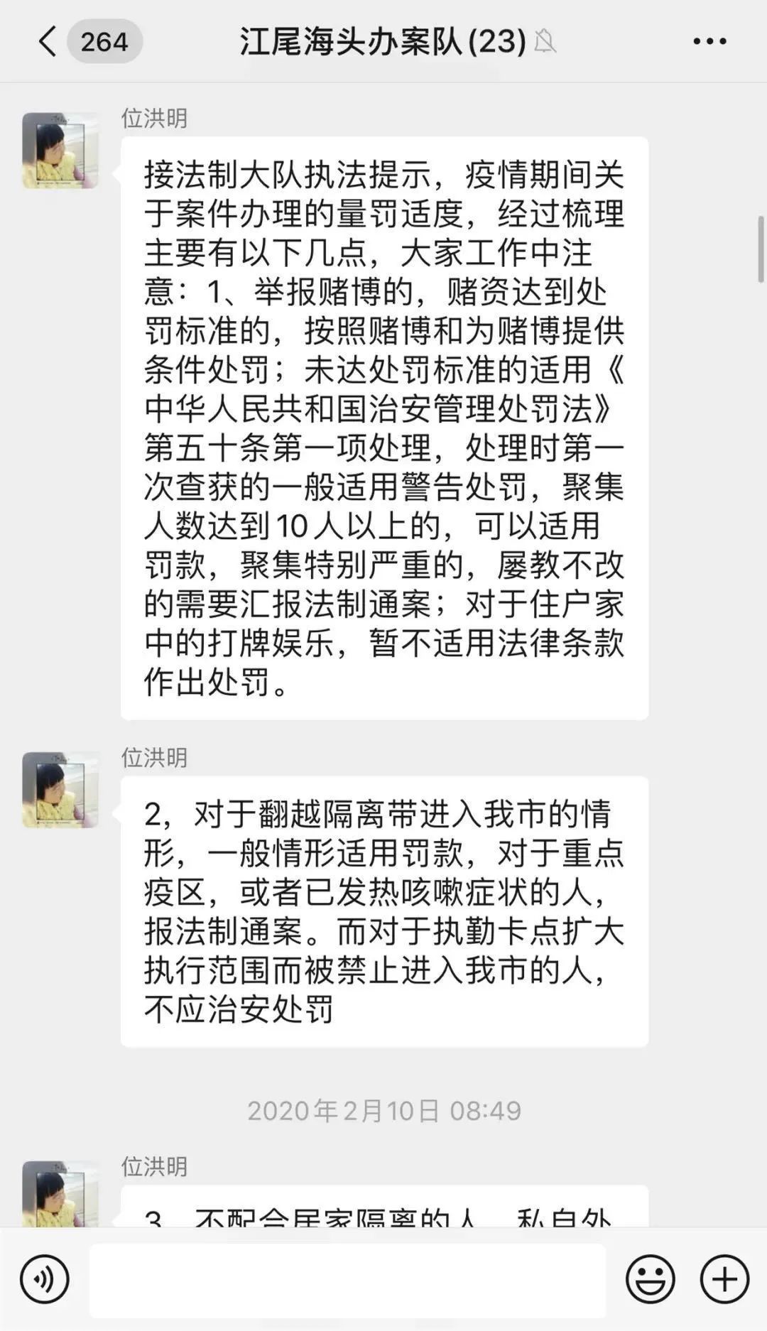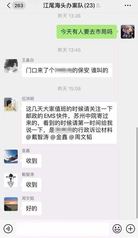 位洪明自己精通法律、精通办案程序,就是时时刻刻担心同志们因为不细致把好事办成坏事,于是办案队的工作群,几乎成了位洪明“唠唠叨叨”的专场,每天各种叮嘱、提醒,像闹钟一样,在每个办案民警的头上“叮叮当当”响个不停。他发的最后一条信息是20日15:08的,他说:“这几天大家值班的时候关注一下邮政的EMS快件,苏州中院寄过来的,看到的时候请第一时间给我说一下,是范某的行政诉讼材料。@戴智涛@金鑫@周文韬”消息发出12分钟后,他倒在了自己的岗位上。