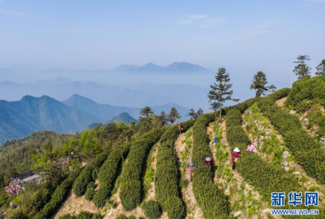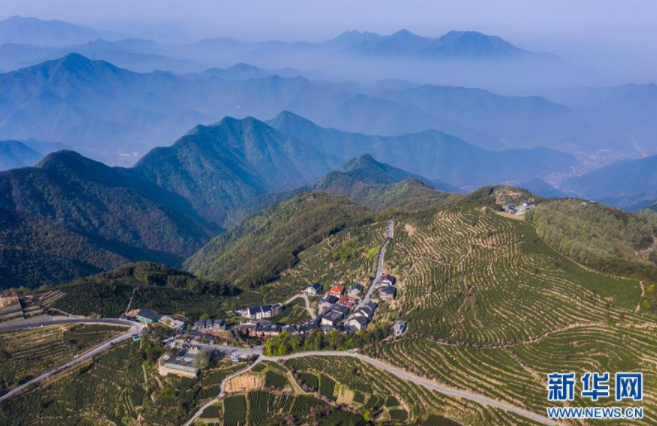 4月10日拍摄的里山镇安顶村的千亩高山茶园,这里是安顶云雾茶的主要产区(无人机照片)。随着气温的升高,浙江省杭州市富阳区里山镇的高山云雾茶进入大规模采摘和销售期,里山镇共有茶园6100多亩,其中约一半是生长在海拔700米茶园的安顶高山云雾茶。近年来,当地政府通过多种措施,积极提升高山云雾茶的品质及附加值,同时将高山茶园、樱花林作为乡村旅游主打品牌,修建停车场、拓宽道路,积极推动山村百姓增收致富。新华社记者 徐昱 摄