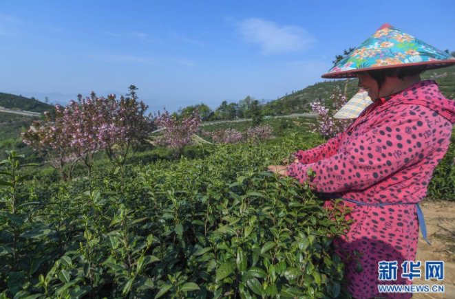 4月10日,里山镇安顶村的高山茶园内茶树与樱花相映成趣。新华社记者 徐昱 摄