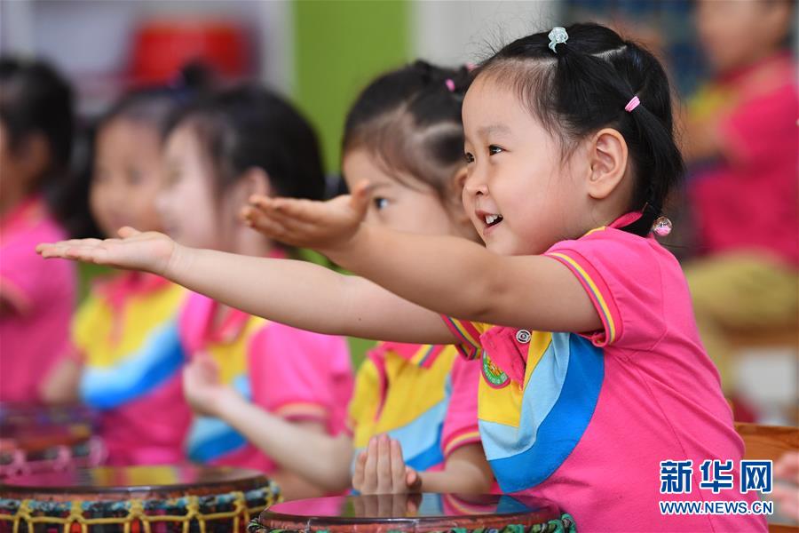 幼儿园小班的小朋友在音乐课上学习手鼓(9月16日摄)。 新学期开学以来,山东济南童贝尔幼儿园从儿童视角出发,创新课程设置,寓教于乐,营造宽松和谐的环境,促进孩子们健康成长。 新华社记者 朱峥 摄