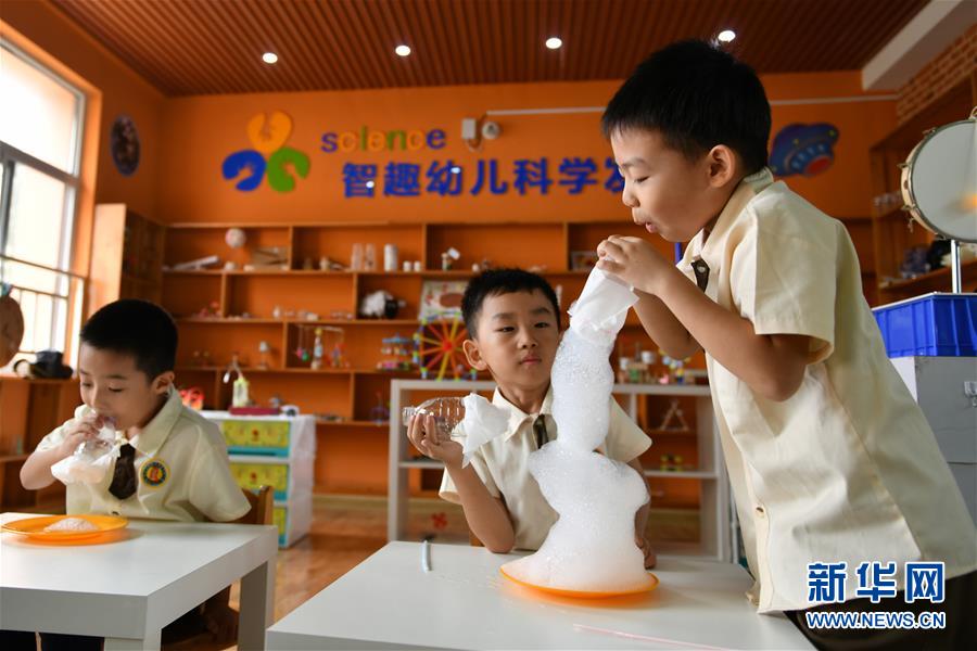 幼儿园大班的小朋友在科学课上体验“微孔泡泡”游戏(9月16日摄)。 新学期开学以来,山东济南童贝尔幼儿园从儿童视角出发,创新课程设置,寓教于乐,营造宽松和谐的环境,促进孩子们健康成长。 新华社记者 朱峥 摄