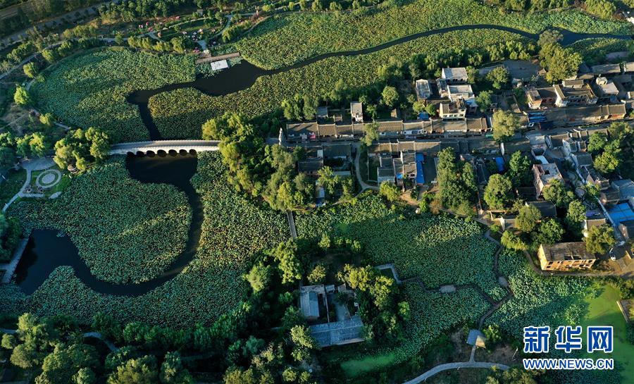 9月18日拍摄的棣花古镇千亩荷塘(无人机照片)。这里碧叶连天、花香四溢,呈现出陕南乡村悠然恬静之景。 在秦岭深处的陕西省商洛市丹凤县丹江之滨,有一处美丽的棣花古镇。宋金边城、清风老街、千亩荷塘、商山绿道、丹江国家湿地公园等美景,让游客在历史与文化、生态与自然、民风与民俗的交融中,心旷神怡,流连忘返。 新华社记者 陶明 摄