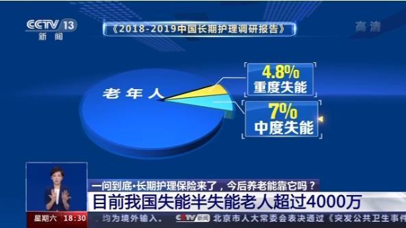 还有一个数据值得关注:超过4000万!这是目前我国失能、半失能老人的数量,而这一数字还在增长。在中国保险行业协会、中国社科院日前联合发布的《2018-2019中国长期护理调研报告》中还有这样一组数据,有4.8%的老年人处于日常活动能力重度失能、7%处于中度失能状态,总失能率为11.8%。也就是说,超过十分之一的老年人在穿衣、吃饭、洗澡、如厕等方面的基本生活无法完全自理。基本自理能力的衰退也伴随着独立生活能力的退化,25.4%的老年人需要全方位照料。