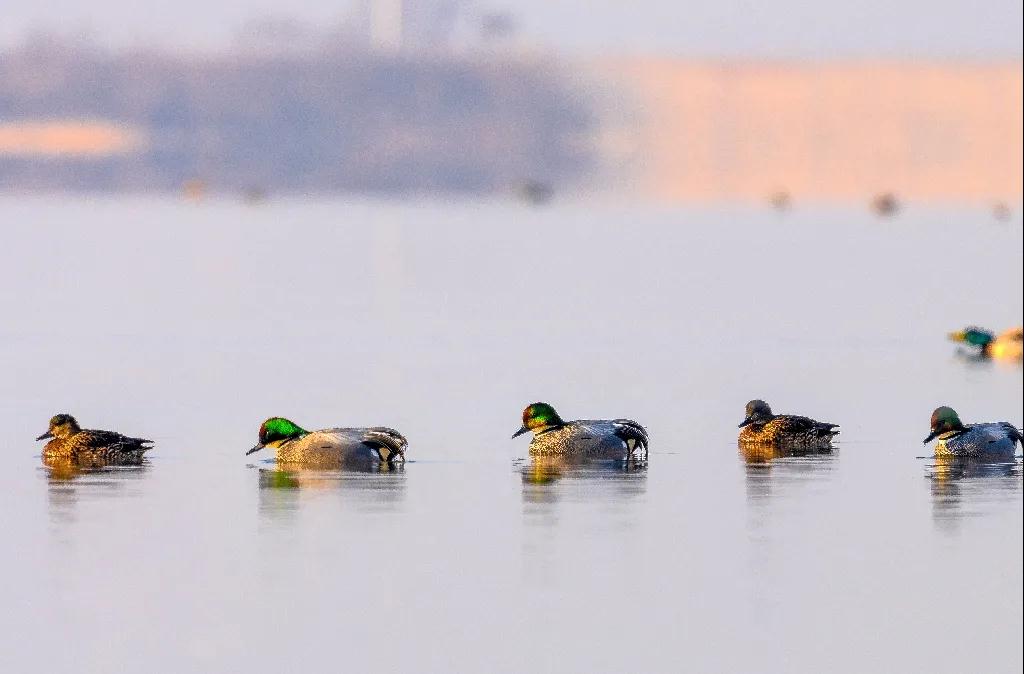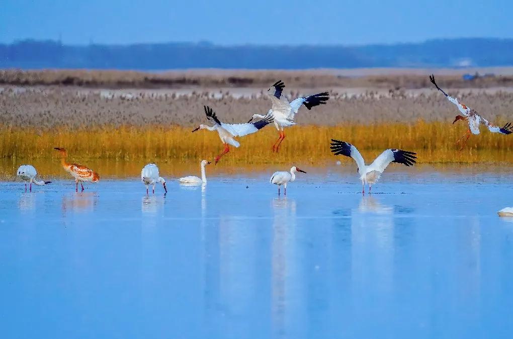 现在我们的亲戚朋友,像琵嘴鹭、螺纹鸭、针尾鸭、白眉鸭、青头潜鸭、凤头潜鸭、赤麻鸭、白秋沙鸭等等100多个家族,近万个朋友,都喜欢到这里找我玩儿。就连国家一级保护鸟类——东方白鹳也经常到我家做客。