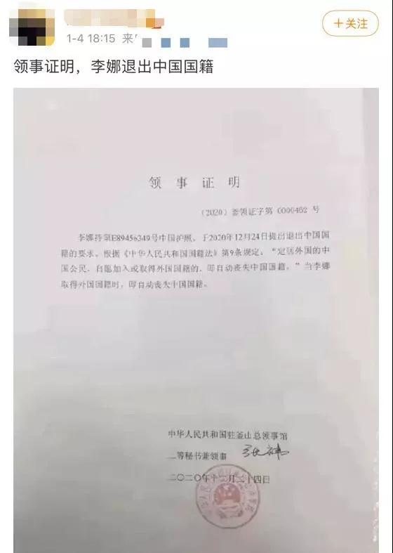1月4日,某律师在社交平台上曝光了一张领事证明,并配文“领事证明,李娜退出中国国籍”,一石激起千层浪。相信很多网友都被“李娜”这个名字骗进来了。很多人都觉得,李娜这个名字,是指代2011年法国网球公开赛、2014年澳大利亚网球公开赛女子单打冠军,亚洲第一位大满贯女子单打冠军李娜。