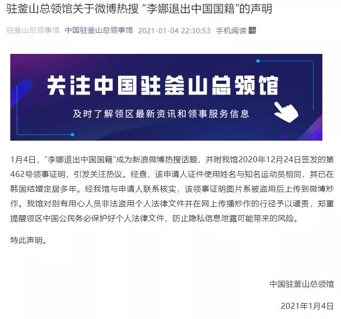 1月4日晚,中国驻釜山总领馆发布公告称:“经查,该申请人证件使用姓名与知名运动员相同,其已在韩国结婚定居多年。经我馆与申请人联系核实,该领事证明图片系被盗用后上传到微博炒作。中国驻釜山总领馆对别有用心人员非法盗用个人法律文件并在网上传播炒作的行径予以谴责,郑重提醒领区中国公民务必保护好个人法律文件,防止隐私信息泄露可能带来的风险。”