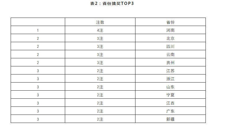此外,黑龙江、山西、河北、福建、重庆、陕西、吉林、湖北各中出1注。