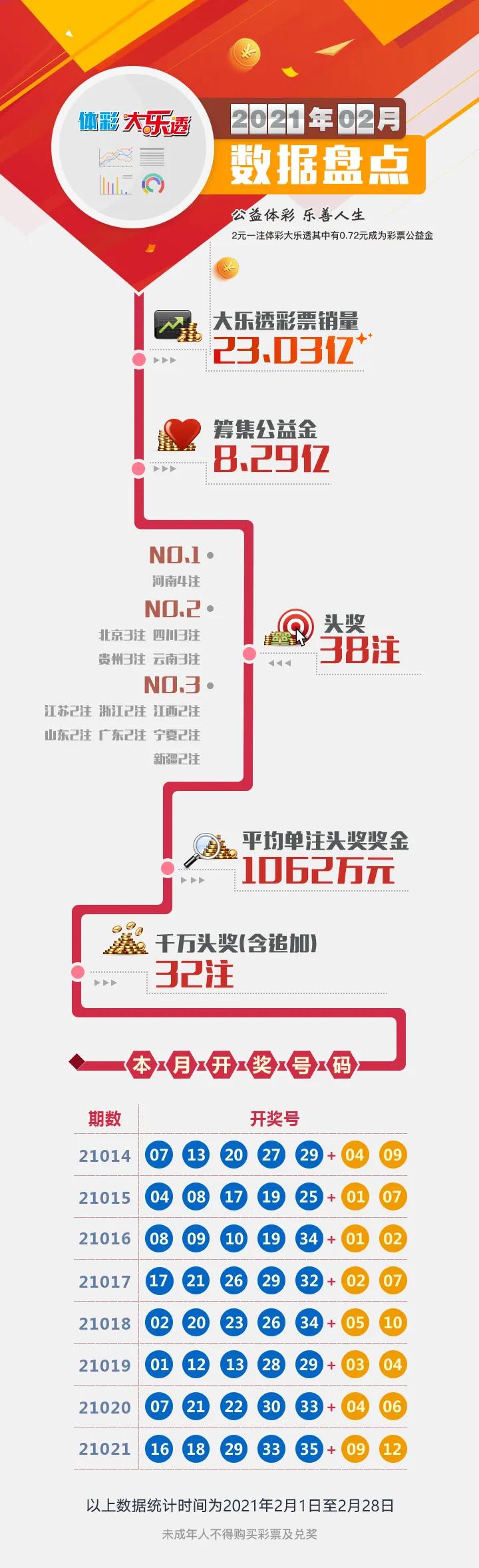 2月份,逢春节彩票休市,超级大乐透共开奖8期(第21014期至第21021期)。其间,全国累计中出一等奖38注,平均每期开出4.75注,平均每注奖金1062万元,其中32注为1000万元及以上大奖。单人最高中奖2506万元,单注最高奖金1800万元。全国累计销售23.03亿元,筹集公益金8.29亿元。
