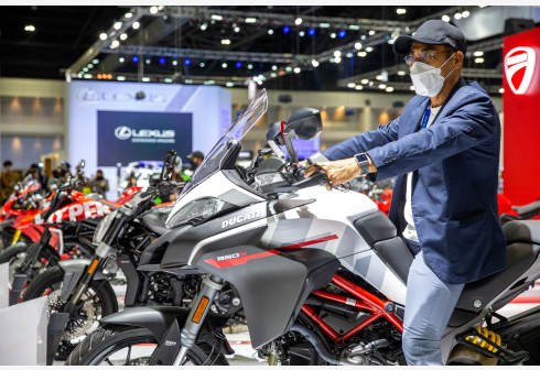 12月1日,一名男子在泰国曼谷举行的第38届泰国国际车展上试骑摩托车。
