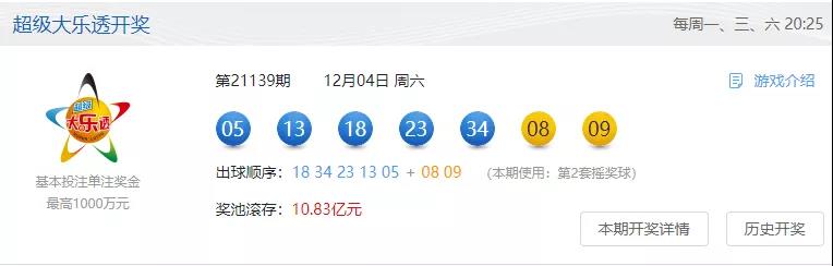 奖池方面,本期开奖结束后,10.83亿元滚存至12月6日(周一)开奖的第21140期。