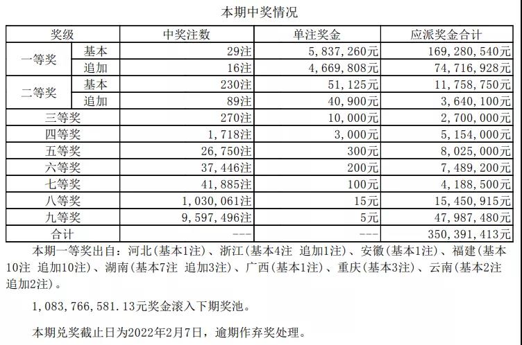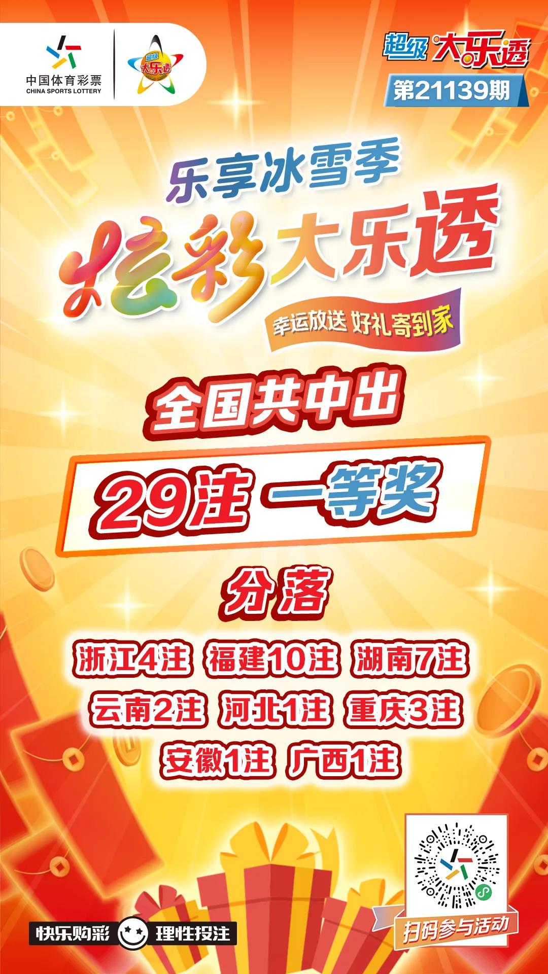 本期全国共开出29注一等奖。其中,16注为1050万元(含466万余元追加奖金)追加投注一等奖,分落福建泉州(10注)、湖南邵阳(3注)、云南楚雄(2注)、浙江温州;13注为583万余元基本投注一等奖,分落湖南邵阳(3注)和永州,重庆北碚(2注)和江津,浙江台州、宁波和绍兴,河北唐山,安徽合肥,广西南宁。