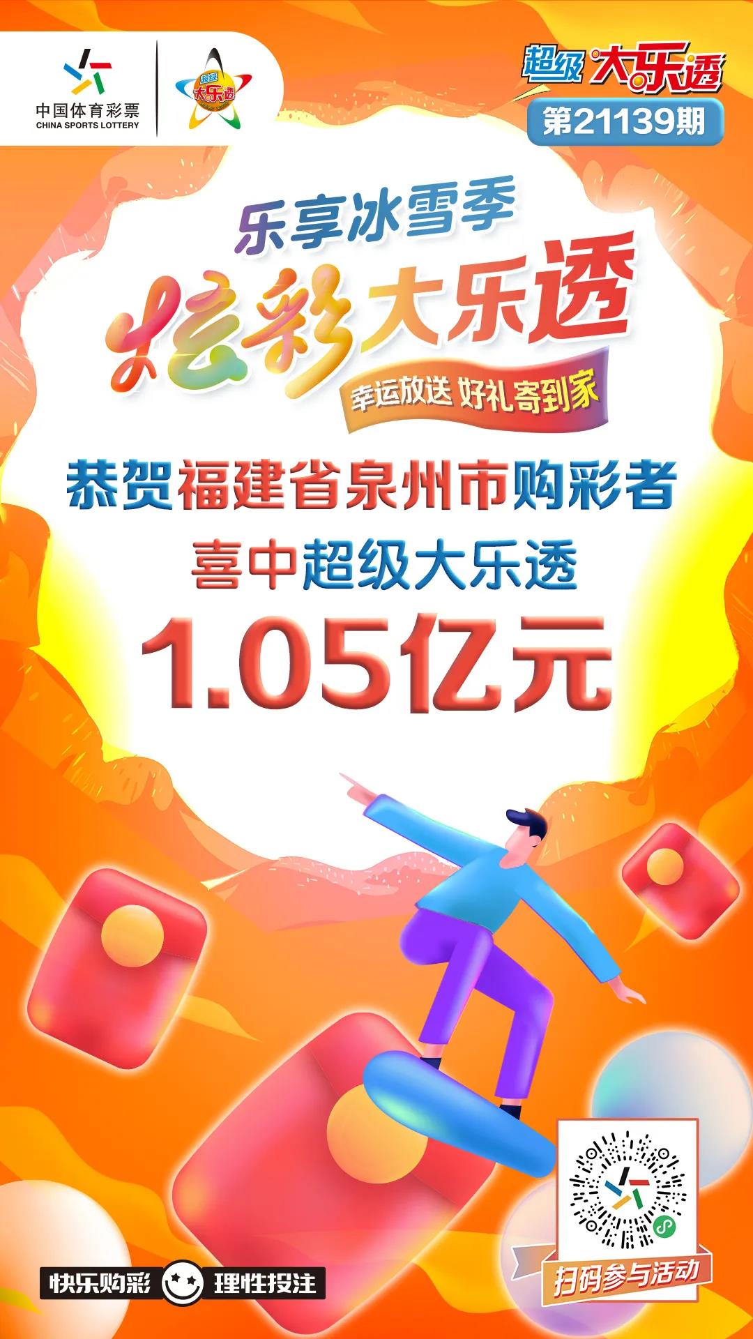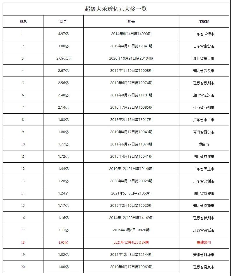 值得一提的是,数据显示,福建泉州中出的10注1050万元全部出自同一体彩实体店,中奖彩票为一张经10倍投的、1注号码、30元投入的单式追加倍投票,单票擒奖1.05亿元,成为超级大乐透历史上中出的第20个亿元大奖,目前排名第18位。