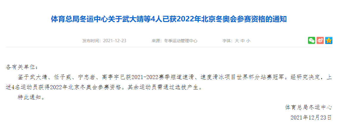 该公告中表示,鉴于武大靖、任子威、宁忠岩、高亭宇已获2021-2022赛季短道速滑、速度滑冰项目世界杯分站赛冠军。经研究决定,上述4名运动员获得2022年北京冬奥会参赛资格。其余运动员需通过选拔产生。