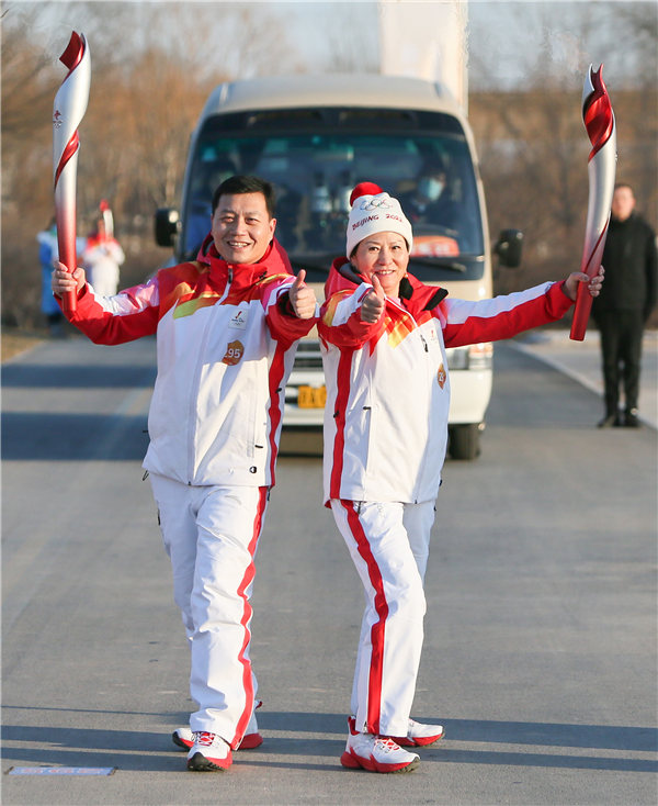2月2日,火炬手李秀平(右)与李学征进行火炬传递。 新华社记者 孟晨光 摄