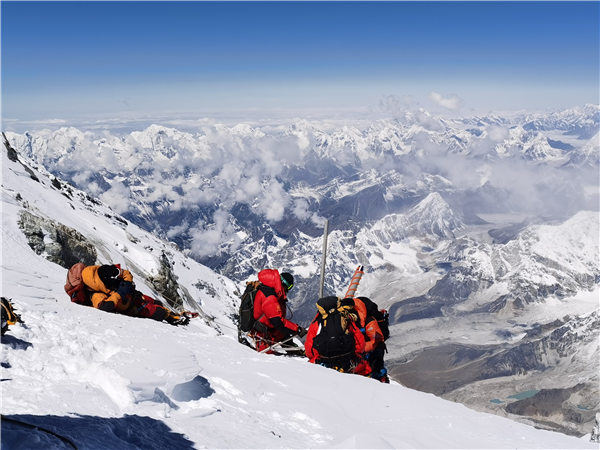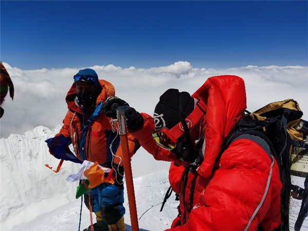 5月4日,科考队员登上珠穆朗玛峰峰顶。新华社特约记者 索朗多吉 摄