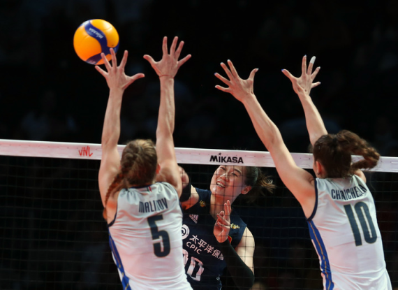 6月4日,2022年世界女排联赛分站赛上,中国队以3:1战胜意大利队。图为中国队球员王云蕗(中)在比赛中扣球。新华社发(穆斯塔法·卡亚摄)