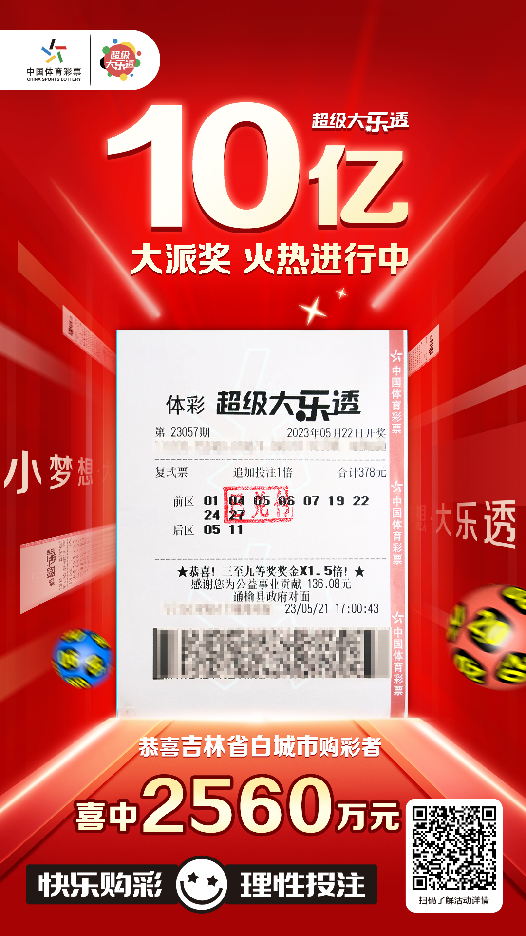 5月22日,超级大乐透第23057期开奖,前区开出号码01、05、06、19、24,后区开出号码05、11。这也是今年超级大乐透10亿元大派奖活动的第19期开奖。本期开出8注一等奖,6注为单注奖金1000万元的基本投注一等奖,2注为单注奖金2549万元(含800万元追加奖金+416万元基本投注派奖奖金+333万元追加投注派奖奖金)的追加投注且派奖一等奖,落户吉林、辽宁。吉林的中奖幸运地位于白城市通榆县政府对面的2211011716体彩代销点。