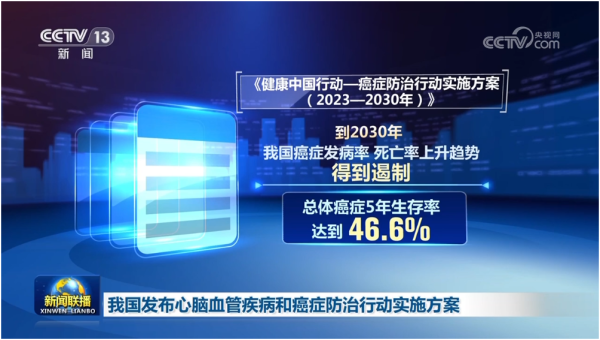 央视网消息(新闻联播):国家卫生健康委、国家发展改革委等部门11月15日发布了心脑血管疾病和癌症防治行动实施方案。在癌症方面,《实施方案》提出,到2030年我国癌症发病率、死亡率上升趋势得到遏制,总体癌症5年生存率达到46.6%,各地要完善癌症防治服务体系、规范癌症诊疗以及加强患者救助救治保障等,疾病负担得到有效控制。