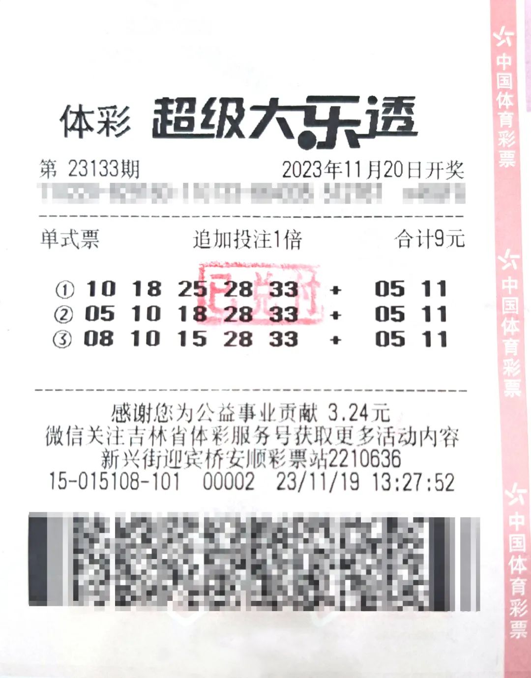 11月20日,体彩超级大乐透第23133期开奖,前区开出号码“10、18、25、28、33”,后区开出号码“05、11”。本期全国共开出6注一等奖。其中1注追加投注一等奖,奖金1565万元(含695万元追加奖金),落于编号2215015108的吉林延边州延吉市新兴街迎宾桥安顺彩票站。11月22日,幸运中奖者李先生(化姓),冒着小雨来到吉林省体育彩票管理中心领取大奖。