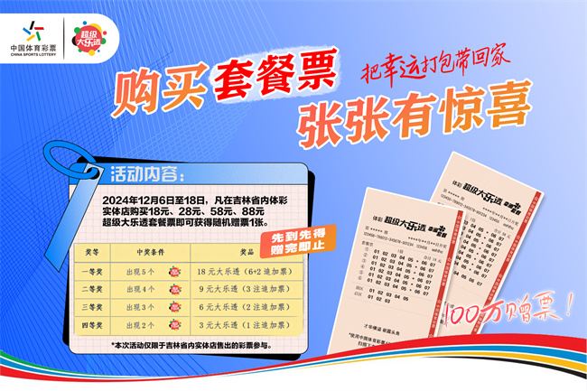 12月6日起,凡在吉林省体彩实体店购买超级大乐透18元、28元、58元、88元套餐票即可随机获得赠票一张,赠票面值在套餐票营销区有显示,赠送的彩票随套餐票后直接机选出票。100万元赠票款先到先得,赠完为止。