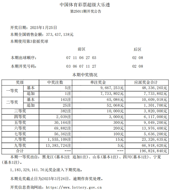 【大乐透】超级大乐透龙年收官 第25011期开出5注一等奖
