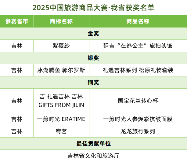 ★日前,2025中国旅游商品大赛颁奖仪式在浙江省义乌市举行,吉林省共获得1金、1银、3铜。其中,延吉“在逃公主”旅拍头饰在本次大赛中获得金奖;吉林省文化和旅游厅被授予“最佳贡献单位”。