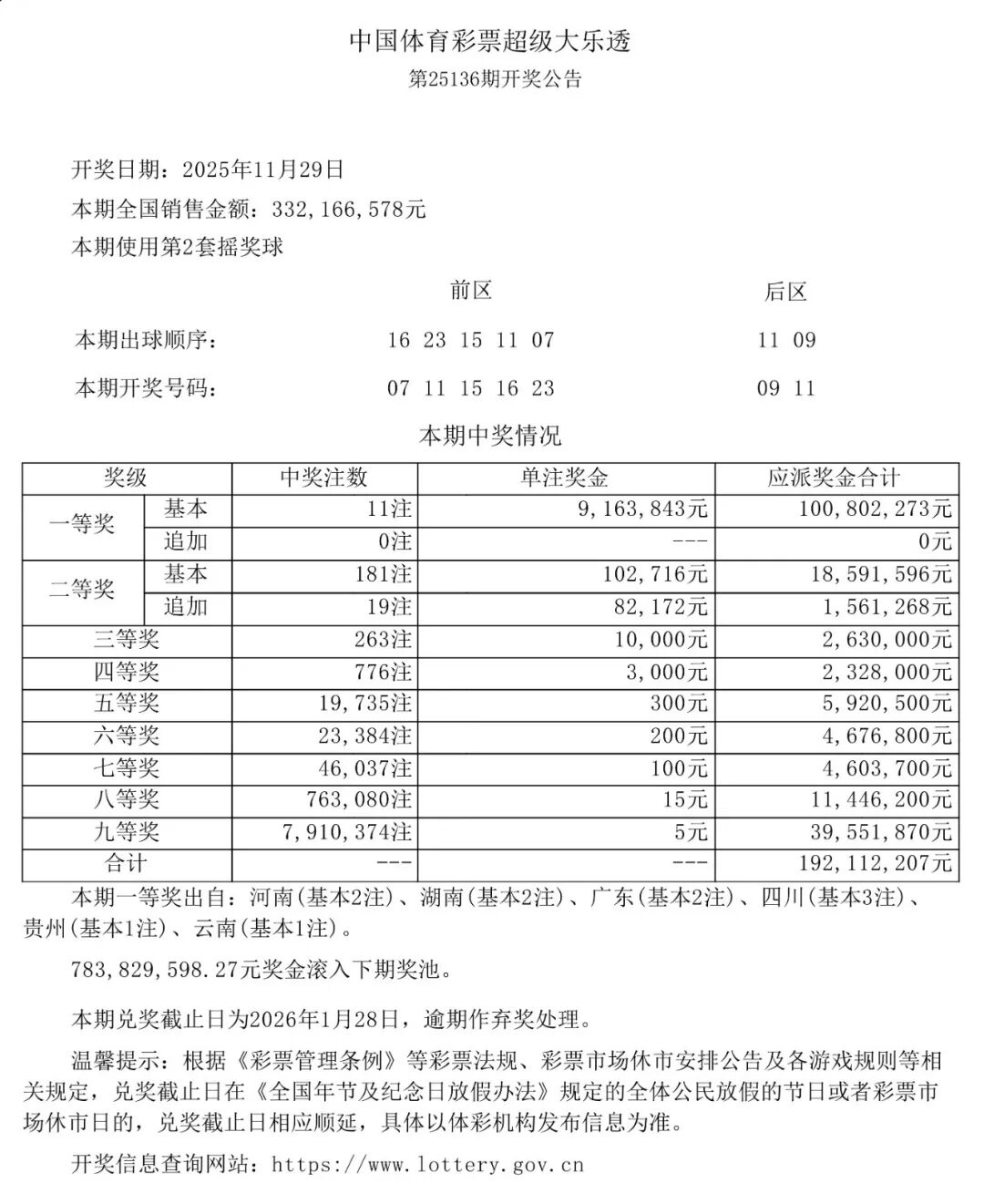 【大乐透】体彩超级大乐透开出11注一等奖