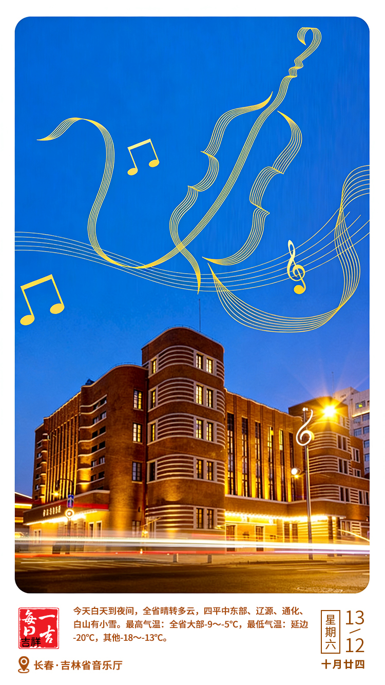 【天气】今天白天,全省多云,长春南部、四平中东部、辽源、吉林大部、通化、白山、延边、长白山保护开发区有小雪,其中白山东部、长白山保护开发区部分地方有中雪。最高气温:全省大部-7~-4℃,最低气温:辽源-19℃,其他-19~-13℃。