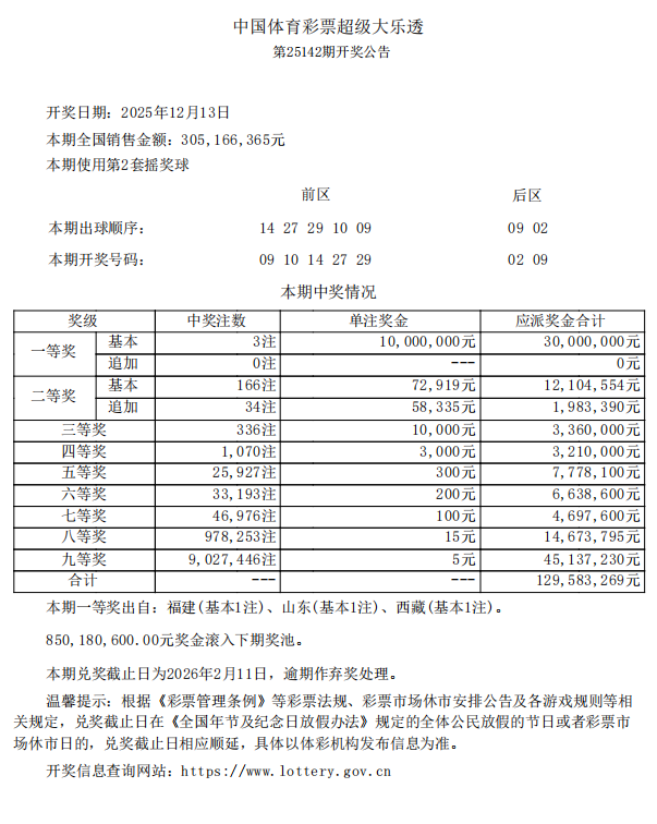 【大乐透】体彩超级大乐透开出3注一等奖