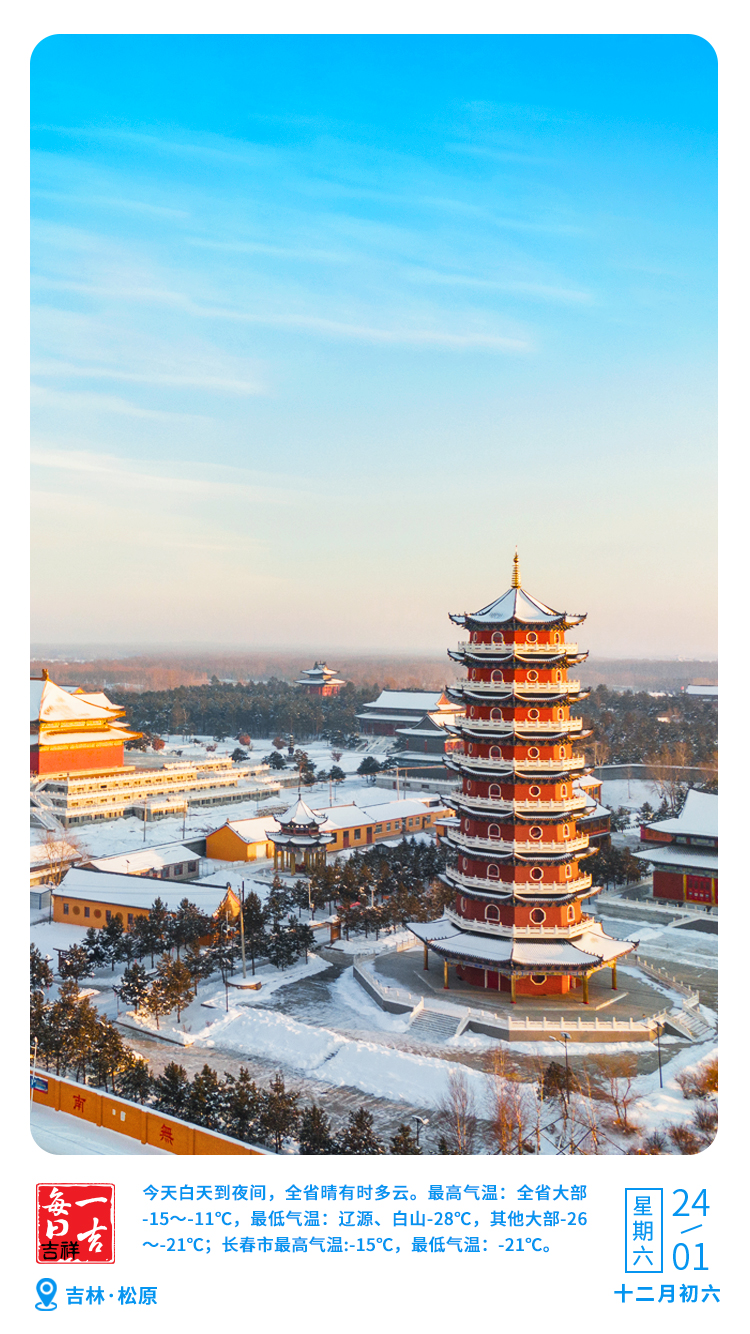 【天气】今天白天,全省晴有时多云。最高气温:全省大部-15~-11℃,最低气温:白山-28℃,其他大部-27~-22℃。全省大部分地区有3~4级偏西风。