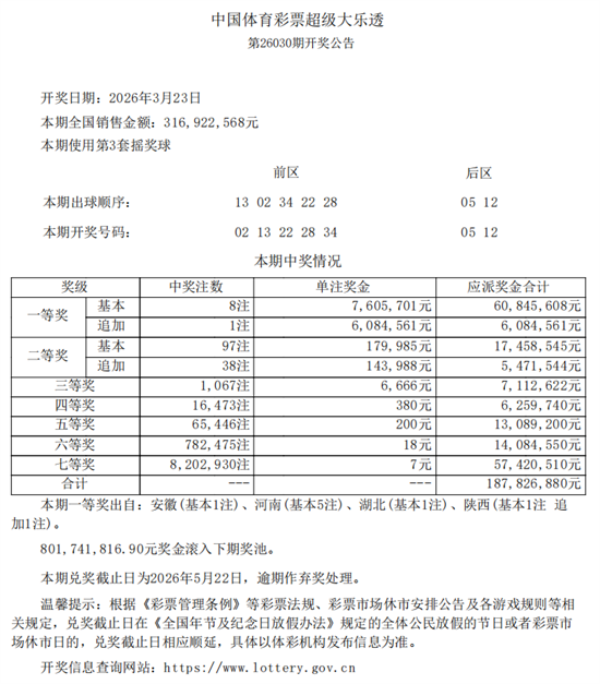 【大乐透】体彩超级大乐透开出8注一等奖