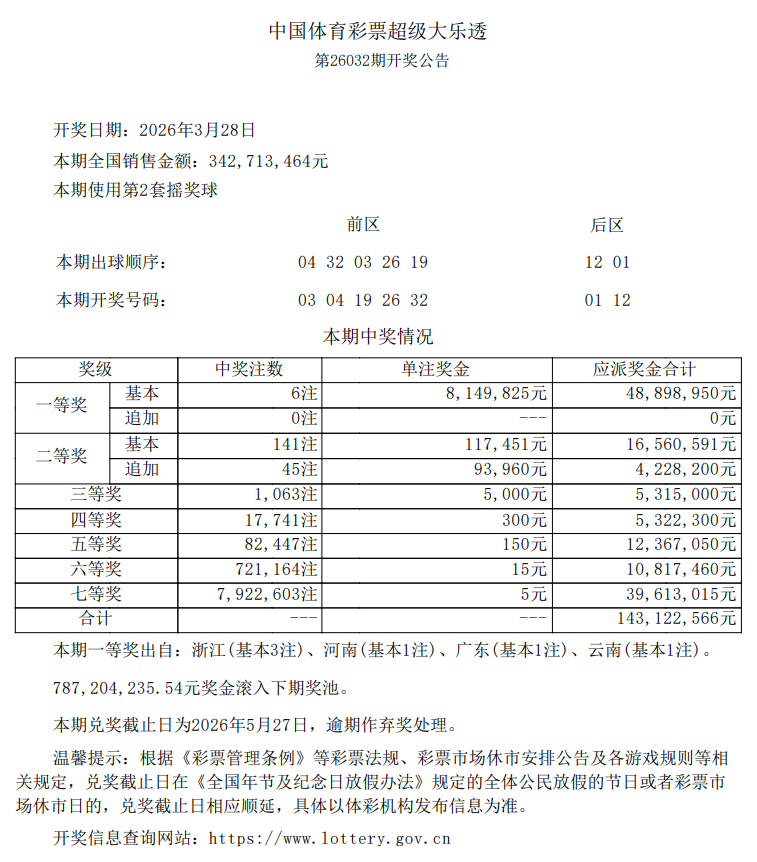 体彩超级大乐透开出6注一等奖
