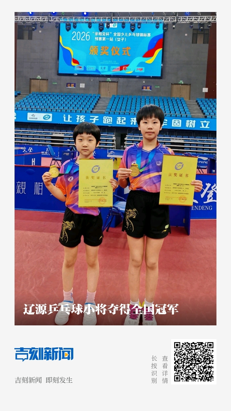 ·4月10日,辽源市西安区乒乓球学校的于上童和张宸睿荣获2026年“亲相见杯”全国少儿乒乓球锦标赛预赛第一站女子乙组团体冠军。