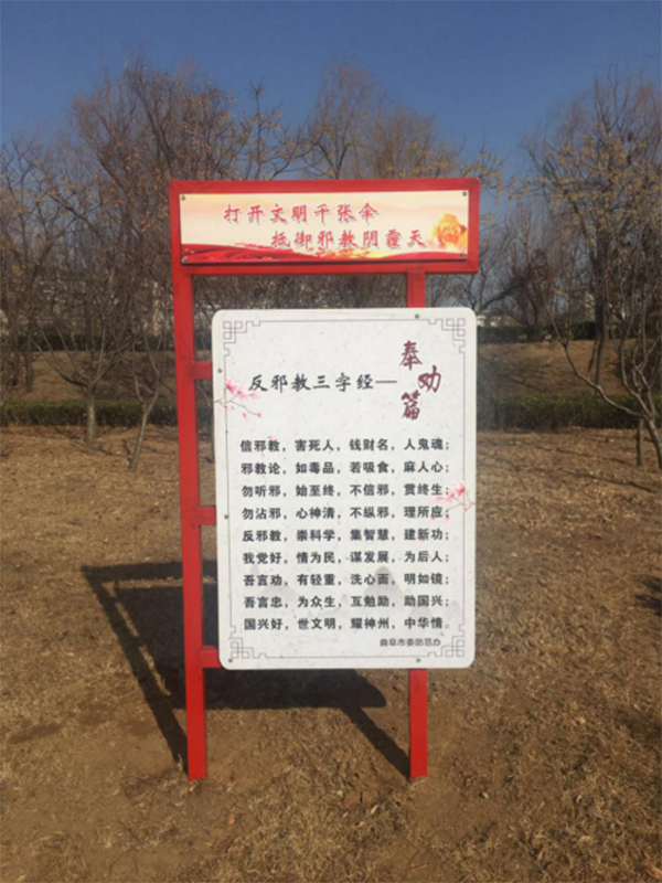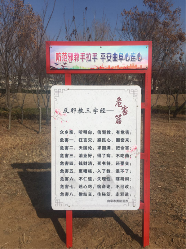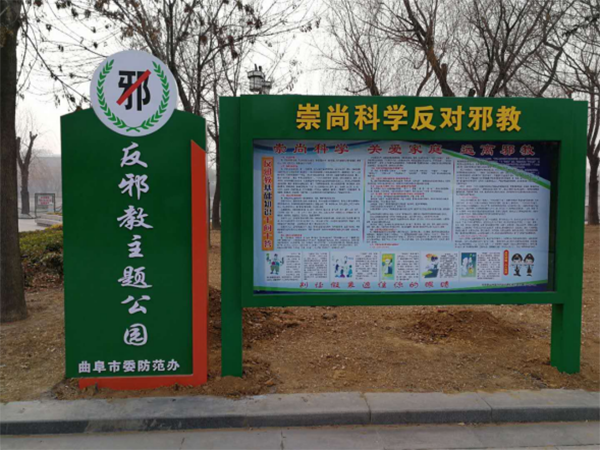 为进一步推进反邪教警示教育工作,增强市民反邪防邪能力。2018年新年伊始,山东省曲阜市防范办在大沂河畔高标准打造反邪教主题公园,让市民在沐浴沂河春风的同时不忘远离邪教。