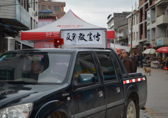 在全县141个村(社区)建立反邪教“一窗一橱”宣传专栏,在主要公路路段悬挂反邪教固定宣传牌或标语。在乡镇建立反邪教教育警示基地,定期组织干部群众参观学习,并利用墟天出动反邪教宣传车巡回宣传。