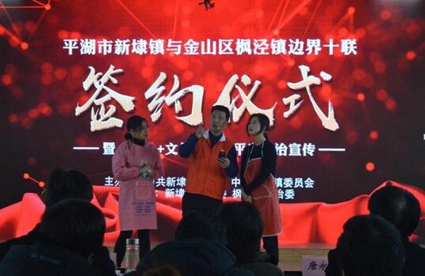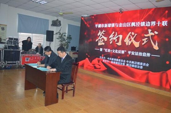 为喜迎新春,防范邪教在浙沪边界渗透活动。1月31日,浙江省平湖市新埭镇与上海市金山区枫泾镇边界十联签约仪式——暨“红色+文化反邪”平安法制宣传共建活动在新埭镇泖河村文化礼堂举行,两地共同合作,资源共享,旗帜鲜明的反对邪教。